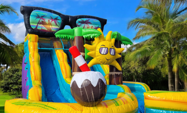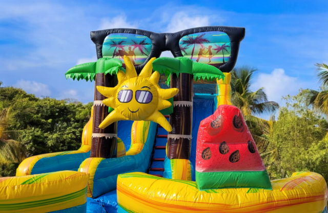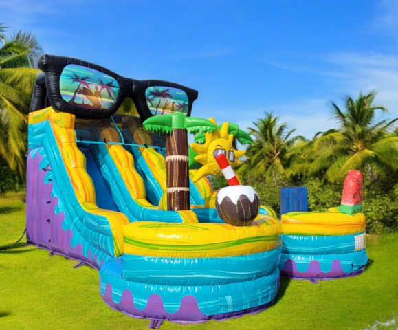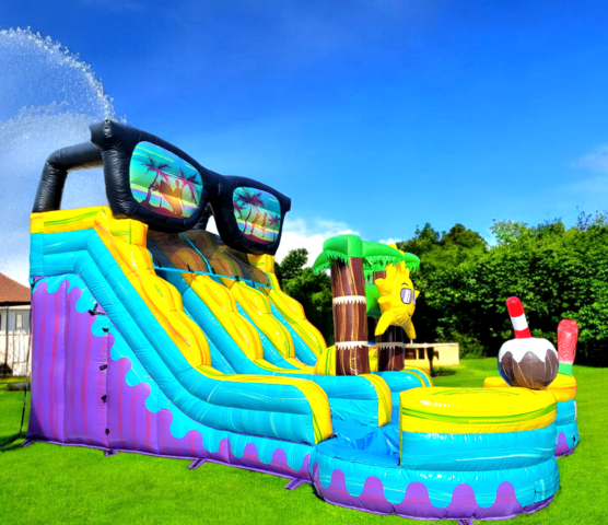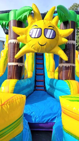 This New SUPER COOL 19ft Tall Sun N Fun Two Lane Water slide is just visually AMAZING. Check out the artwork and design! The attention to detail is CRAZY! Our new PARTY themed inflatables are some of our HOTTEST new themes! This Bounce A Lot Inflatables water slide has one set of stairs in the center front between the slide lanes to allow more people to slide more often and has two pools at the bottom of each slide. This design also makes it easy to monitor the riders from one spot up front. This slide is perfect for your home party, church, school, or company event for boys or girls. 19ft tall water slides are ALL AGES rated so everyone can ride the slide!