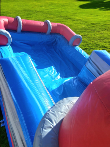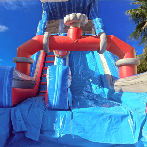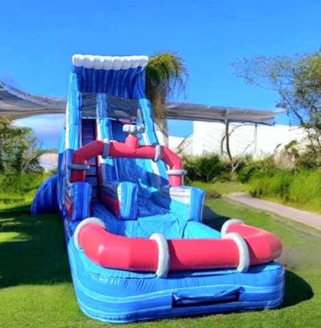 The 18ft tall Water Works Water slide is BRAND NEW. All water all the time. The big wave with the valves and pipes on the slide give this water themed water slide a very cool look! This water slide is designed with a taller deck set up and new slip cover style which will make you slide down SUPER fast! This water slide is perfect for your home party, church, school, or company events. 18ft tall water slides are the entry level units to the ALL AGES rating so everyone can ride the slide! These slides are simple, economical, and will allow you to meet your budget needs and still get a BIGGER slide that usually fits in your yard for home events. You asked for more all ages slides... and you got 'em!